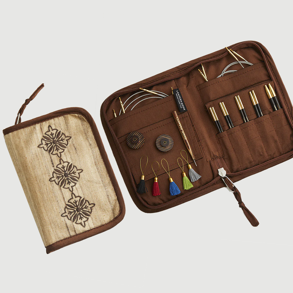 The case is made with Khadi silk, a historically significant Indian material. The exterior features lovely floral motif embroidery. Inside there is room for multiple interchangeable needle tips and cords. The zippered case keeps all contents safely stored and organized. These needle sets are designed by artisans for generations of use by skilled knitters.