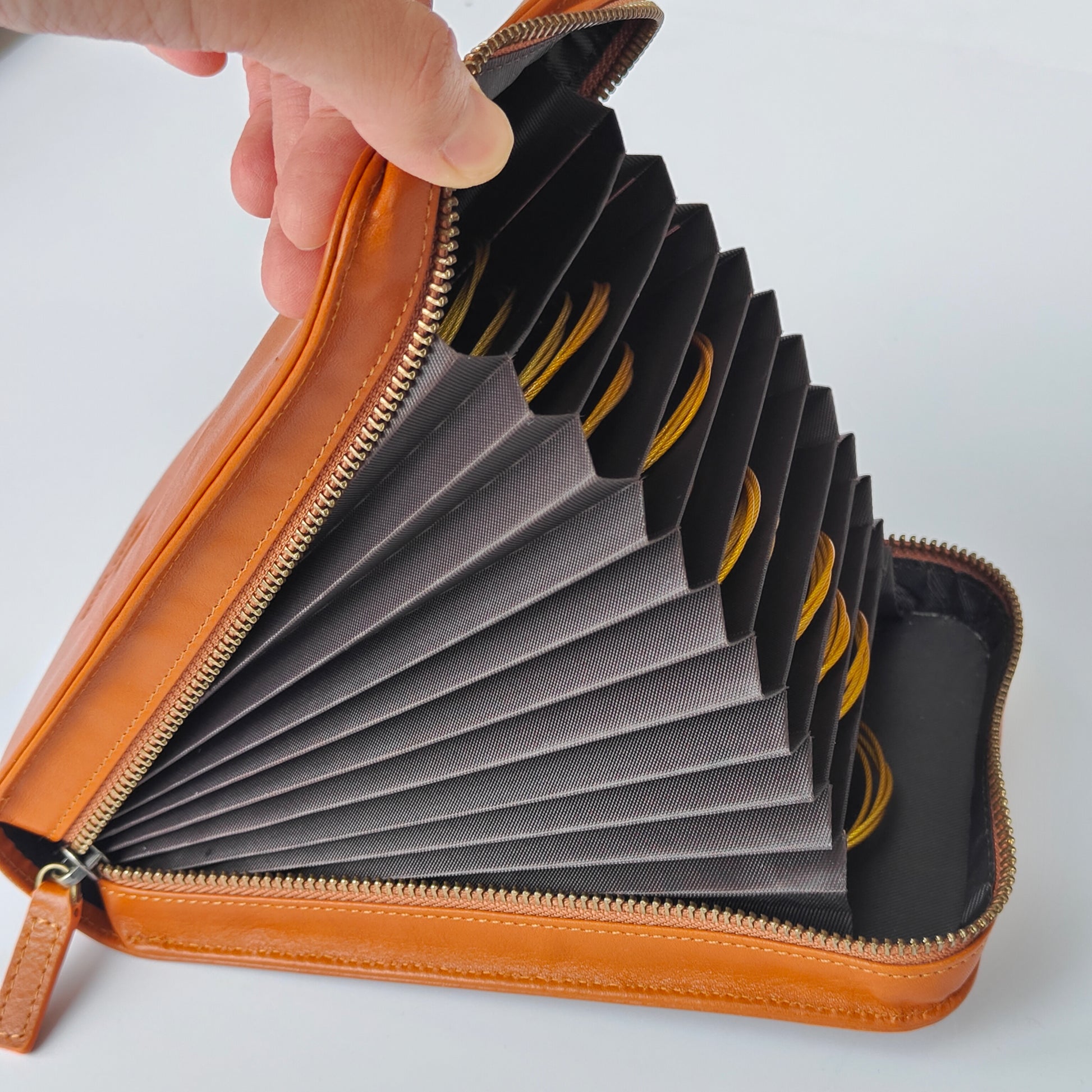 The handcrafted genuine leather case with polydrill lining will organize and store the needles and your other accessories in place. It is easy to carry when you are travelling and you could enjoy the fun of knitting wherever you are!