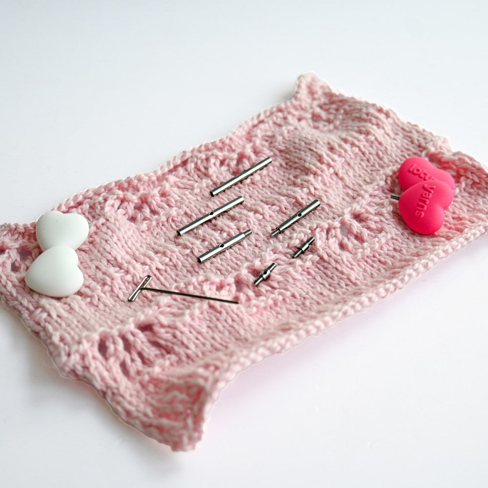Very useful kit for interchangeable needles and cables. It includes all our connectors for cables and needles. These lovely heart shaped point protectors and cable end caps will prevent stitches from slipping off and keep knitting safe.