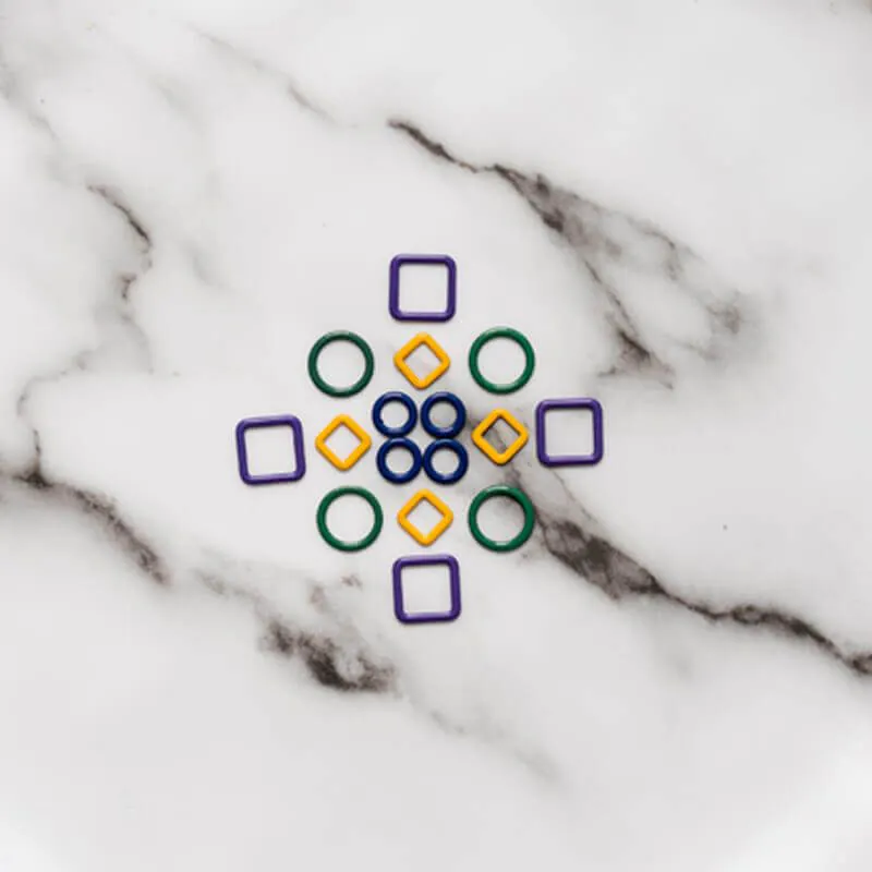 Metallic stitch markers that stick to the magnetic necklace pendant. Easy to slip onto a needle in the middle of your work. Specially designed to use with the Magnetic Knitter’s Necklace Kit.